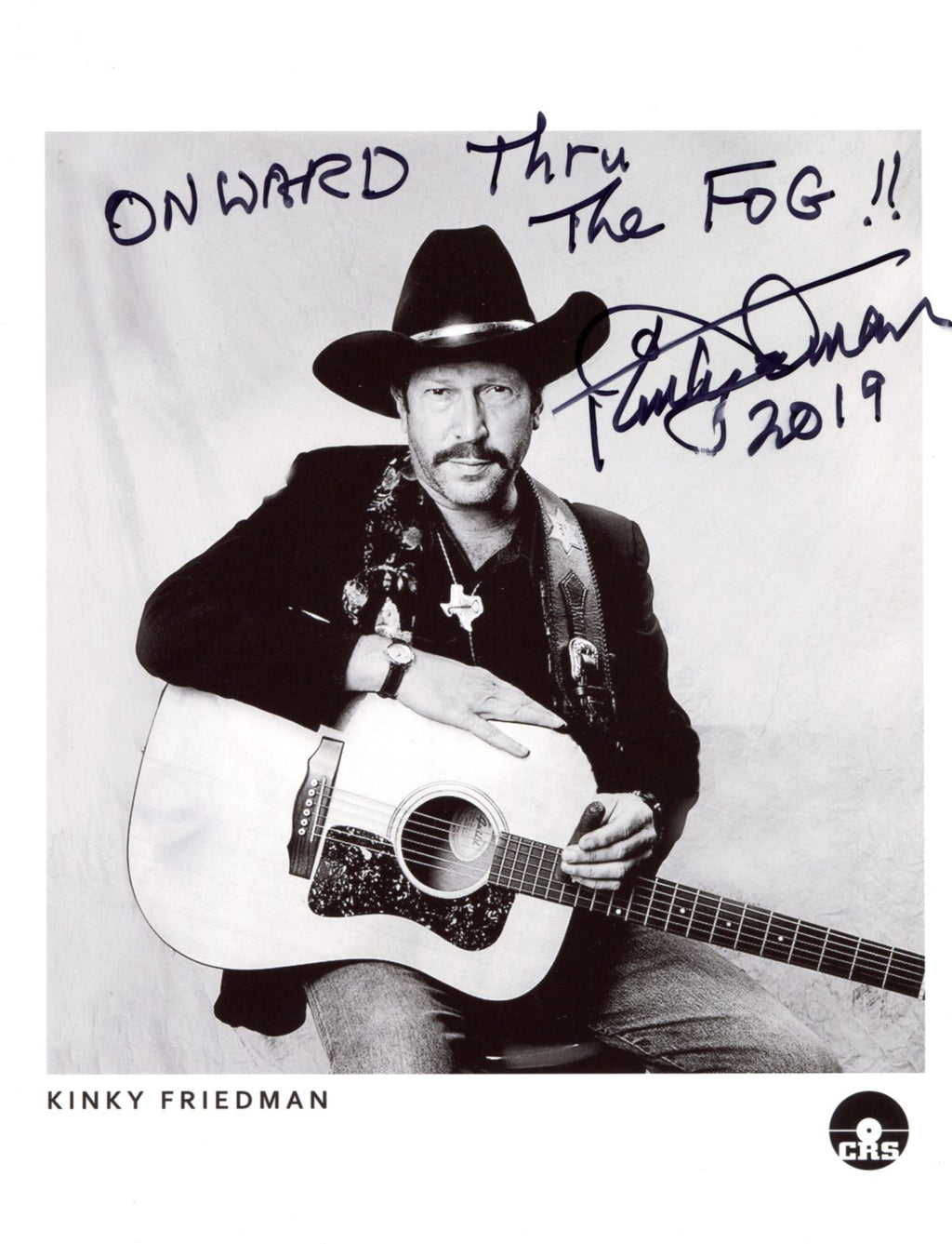 Signed publicity photograph, shows Kinky Friedman in a beautiful 3/4 length pose, 8 x 10,25 inch, signed and inscribed in black felt tip "ONWARD THRU THE FOG!! - Kinky Friedman - 2019", in very fine condition.