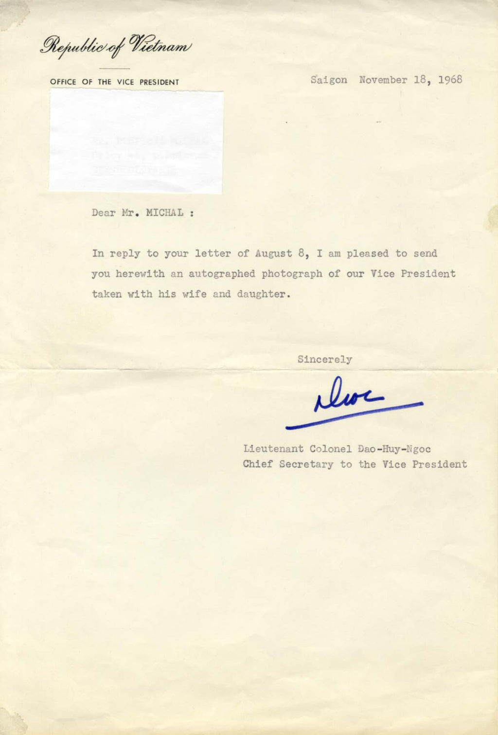Signed vintage photograph, shows Nguyen Cao Ky in a family portrait, 4,5 x 6,75 inch, signed and inscribed in black ink, with scattered very mild signs of wear - in fine to very fine condition. Accompanied by the corresponding (typed) reply letter (Saigon, 1968).