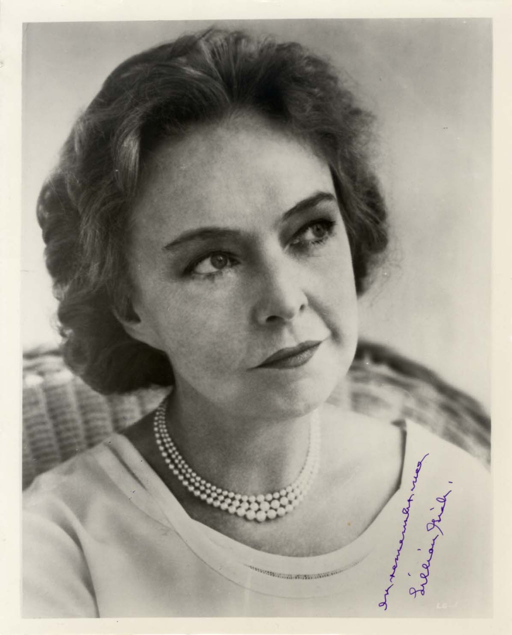 Signed vintage sepia tone glossy photograph, shows Lillian Gish in a chest-up portrait, 8 x 10 inch, signed in blue ink "en remembrances - Lillian Gish", with very mild signs of wear - in nearly very fine condition.