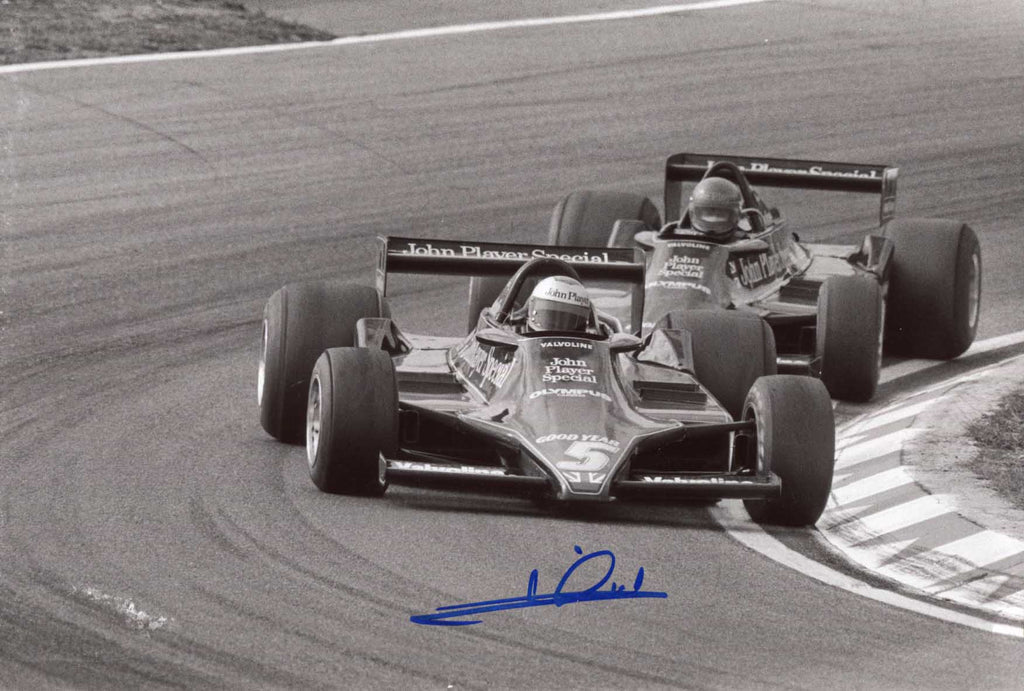 IP signed photograph (b/w), shows Mario Andretti in a racing scene (Lotus), 12 x 8 inch, signed in blue felt tip, obtained In-Person in Barcelona, in very fine condition.