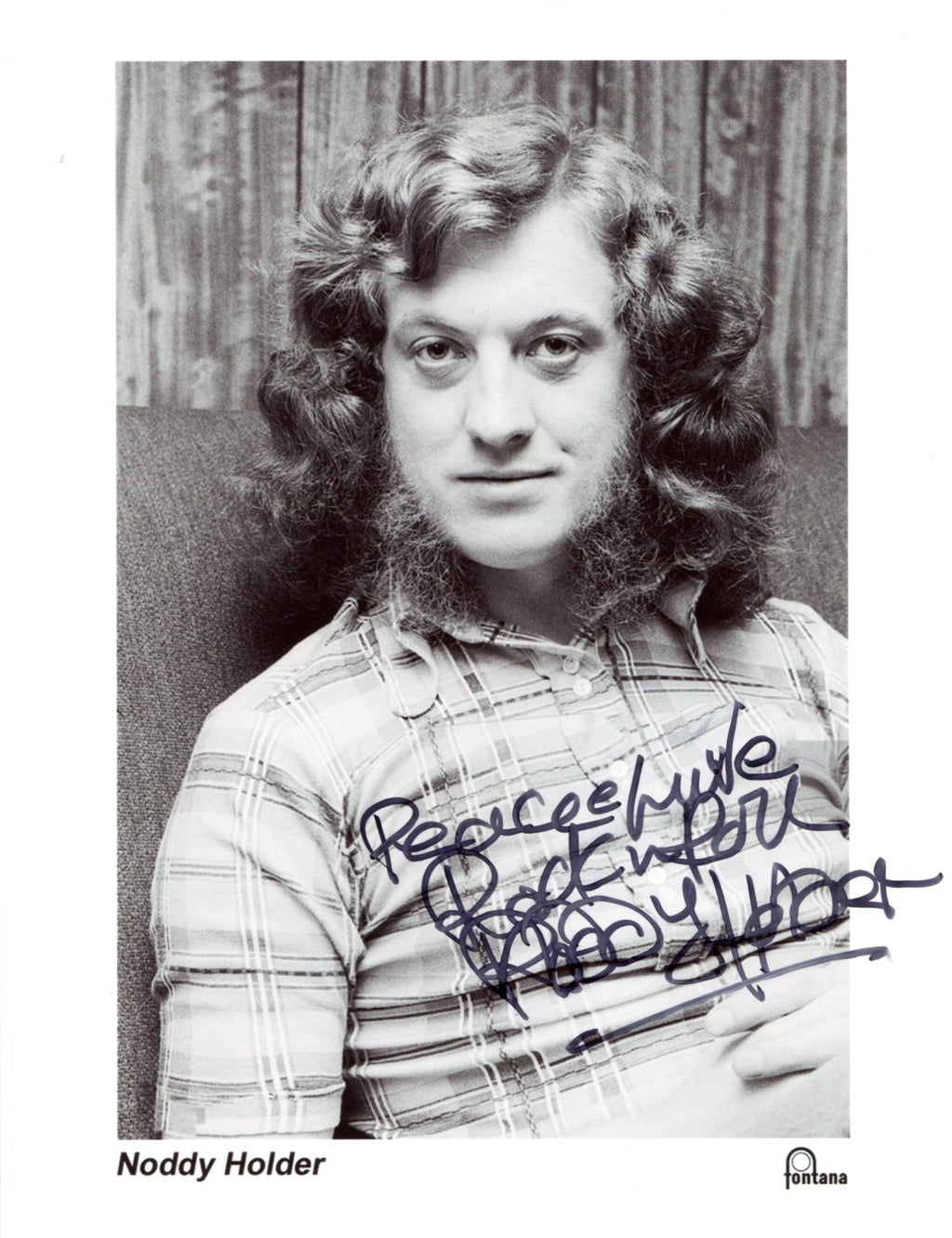 Signed publicity photograph, shows Noddy Holder in a beautiful half length portrait, 8 x 10,25 inch, signed and inscribed in black felt tip "Peace & Love - Rock n Roll - Noddy Holder", in very fine condition.