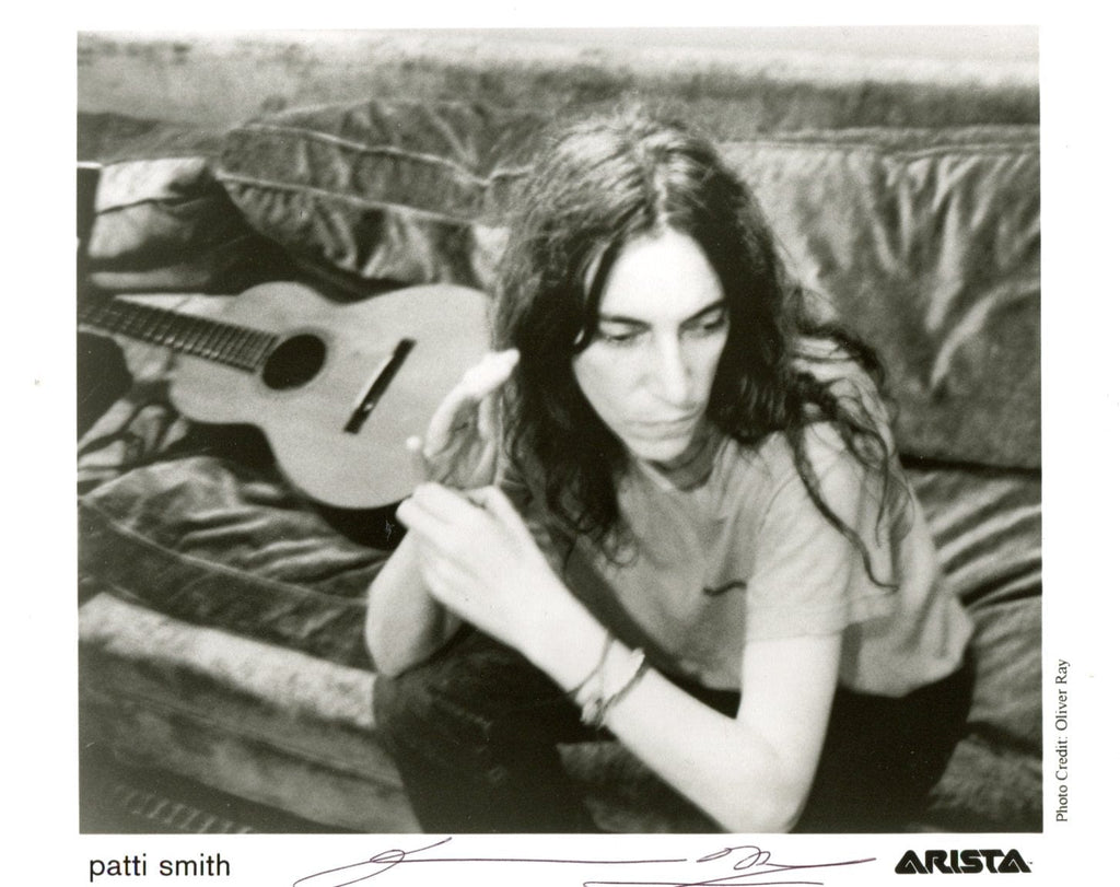 IP signed publicity photograph, shows Patti Smith seated on a couch, 10 x 8 inch, signed in black ballpoint ink "Patti Smith", obtained In-Person, in very fine condition.