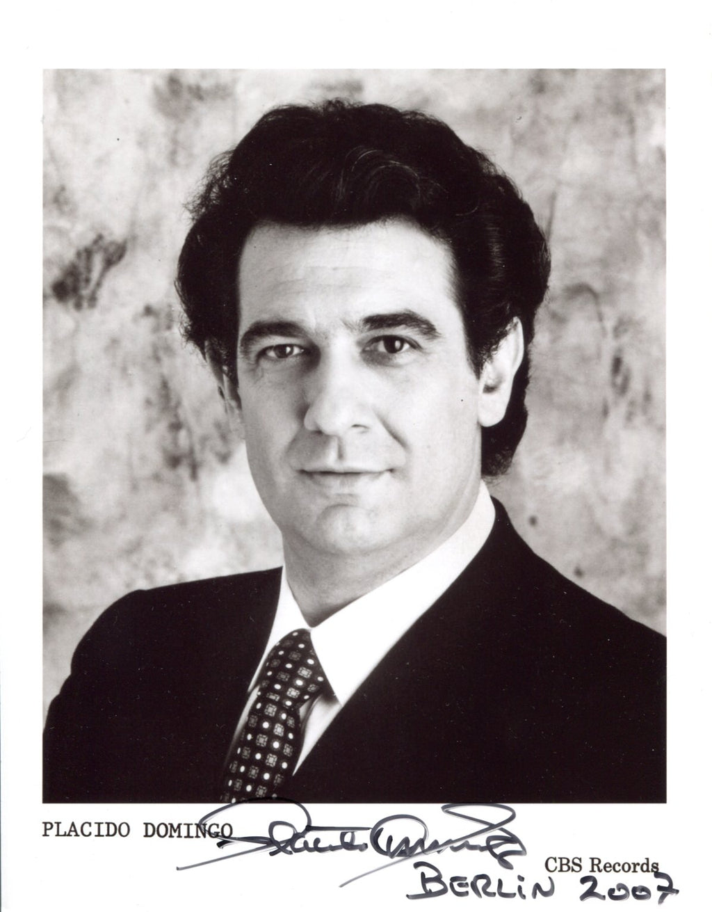 Signed publicity photograph, shows Placido Domingo in a beautiful head and shoulders portrait, 8 x 10,25 inch, signed and dated in black felt tip "Placido Domingo - Berlin 2007", in very fine condition.