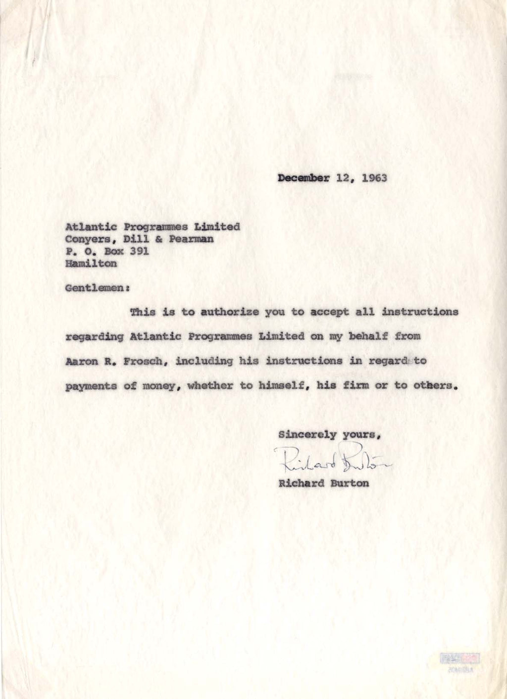 Typed letter signed, one page, 8 x 11 inch, 12.12.1963, authorisation "to accept all instructions regarding Atlantic Programmes Limited on my behalf from Aaron R. Frosch", signed in dark ballpoint ink "Richard Burton", attractively mounted (removable) for display with a photograph, shows Burton in a beautiful close-up portrait (altogether 16,5 x 11,75 inch), with a paper-clip impression to the upper left corner - in nearly very fine condition.