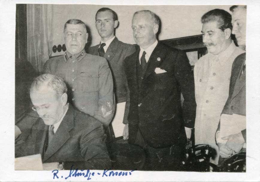 Signed magazine picture (affixed on cardboard), shows Richard Schulze-Kossens with Molotov, Ribbentrop, Stalin and Soviet Chief of Staff Shaposnikov at the signing of the Molotov–Ribbentrop Pact of 23 August 1939, 5,75 x 4 inch, signed by Richard Schulze-Kossens in blue ink "R. Schulze-Kossens", with mild signs of wear - in fine to very fine condition.