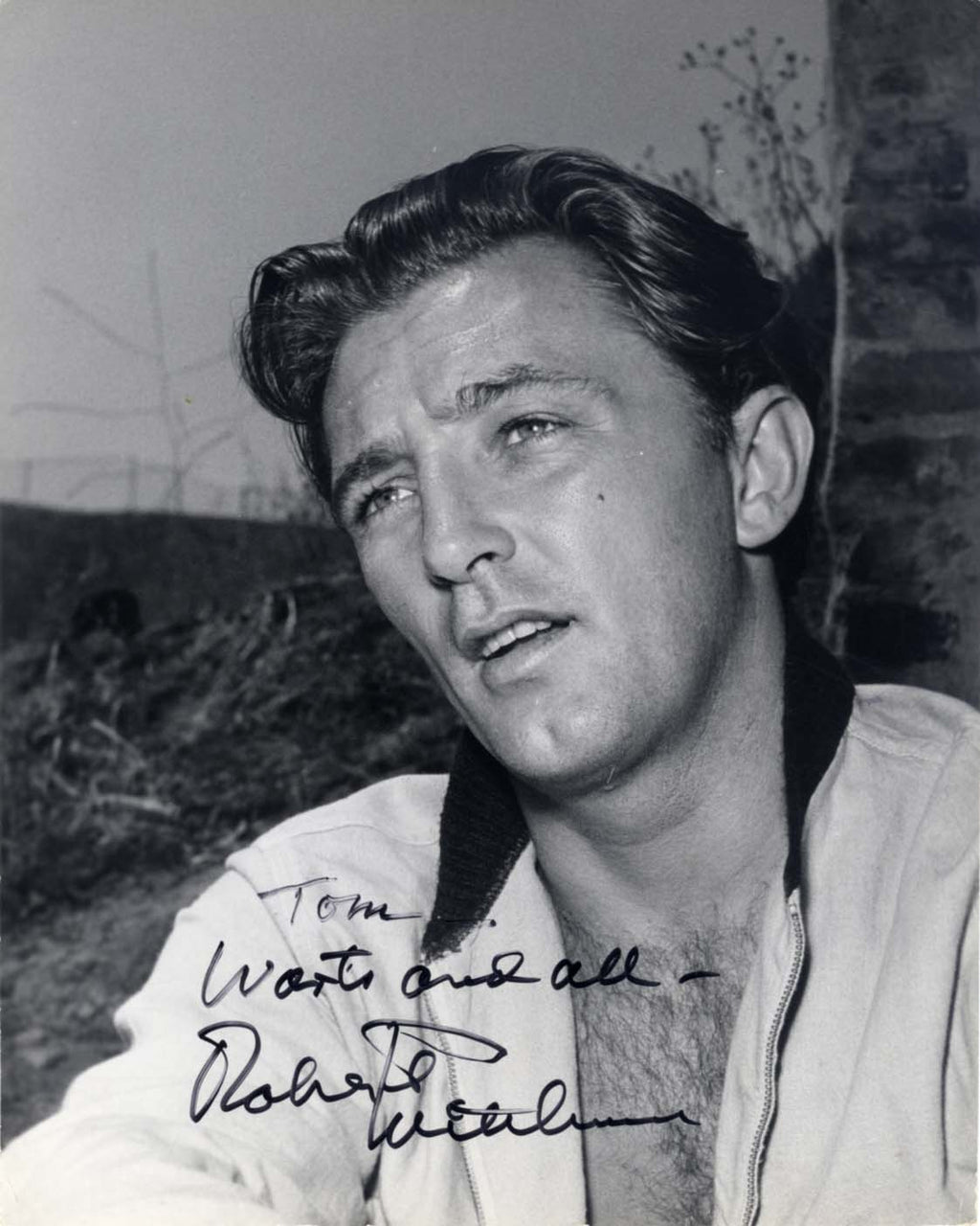 Signed vintage double-weight glossy photograph, shows Robert Mitchum in a close-up portrait, 7,5 x 9,5 inch, signed and inscribed (in later years) in black felt tip "Tom - Warts and all - Robert Mitchum", with slightly trimmed edges and a few small surface impressions  - in fine condition.