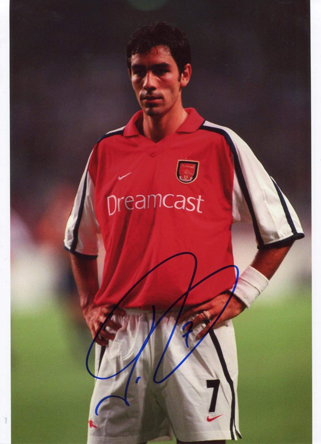 In-Person signed photograph, shows Robert Pires as footballer (Arsenal London jersey), 8 x 11 inch, obtained In-Person in Berlin, signed in blue felt tip, in very fine condition.