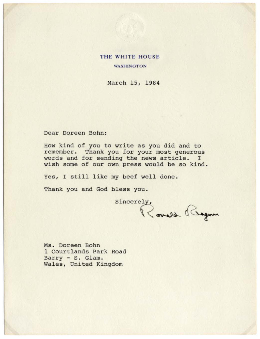 Typed letter signed, one page, 6,75 x 8,75 inch, blind-embossed `The White House` stationery, Washington, 15.03.1984, reply letter to Ms. Doreen Bohn - concerning a news article and the own press, signed in dark ink "Ronald Reagan", attractively mounted (removable) for fine display with a photograph, shows Ronald Reagan in a formal portrait (altogether 16,5 x 11,75 inch), with very mild signs of wear - in nearly very fine condition.