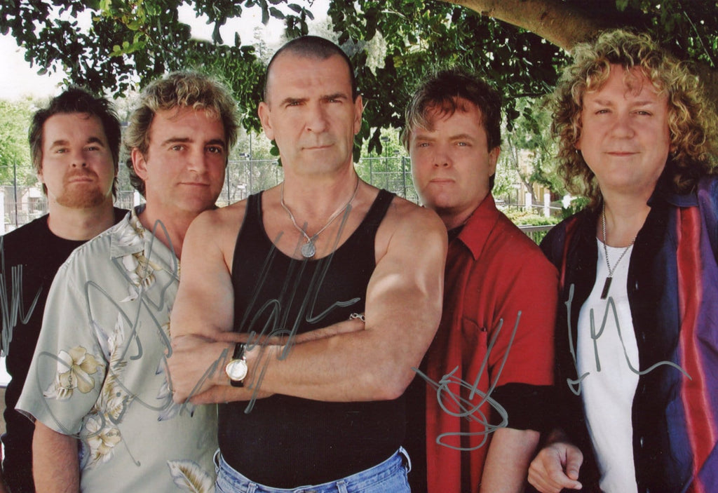 IP signed photograph, shows the progressive rock band `Saga` in a group picture, 12 x 8 inch, obtained in-Person (2007), signed by all five band members in silver felt tip, in very fine condition.