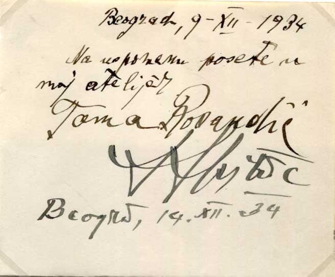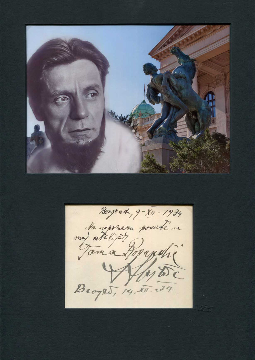Signed album page, 4,25 x 2,25 inch, Belgrade, 12.08.1936, signed and inscribed in blue ink "Beograd, 9-XII-1934 - Na uspomenu posete u moj atelijer - Toma Rosandić" - also signed by an unidentified person, attractively mounted (removable) for fine display with a photo collage, shows Toma Rosandić in front of his `Play of the Black Horses` (altogether 8,25 x 11,75 inch), with very mild signs of wear to the edges - in nearly very fine condition.