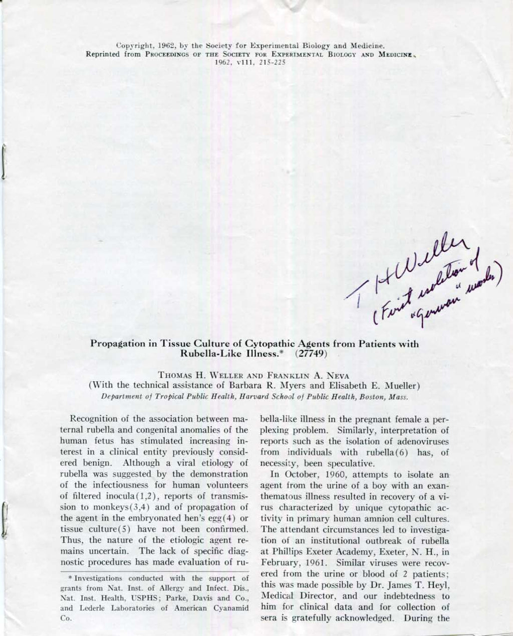Printed scientific article signed, eleven pages, 7,25 x 9 inch, scientific article entitled `Propagation in Tissue Culture of Cytopathic Agents from Patients with Rubella-Like Illness` - reprint from `Proceedings of the Society for Experimental Biology and Medicine` (1962, v111, 215-225), signed and inscribed on the title page by Thomas Huckle Weller in dark ink "T H Weller - [...]", with mild creases and slightly trimmed to the lower edge - in fine condition.