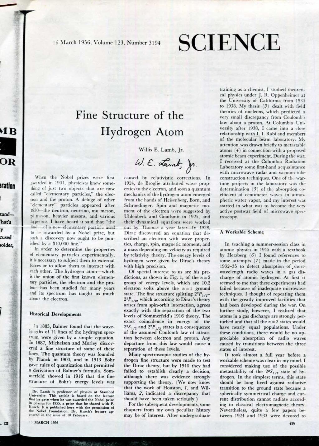 Printed scientific article signed, four pages (stapled together), 8,25 x 11,75 inch, scientific article entitled `Fine Structure of the Hydrogen Atom` by Willis E. Lamb, Jr. - reprint from `Science` (March 16, 1956, Vol. 123, No. 3194), signed in dark ink "W. E. Lamb, Jr.", in very fine condition.