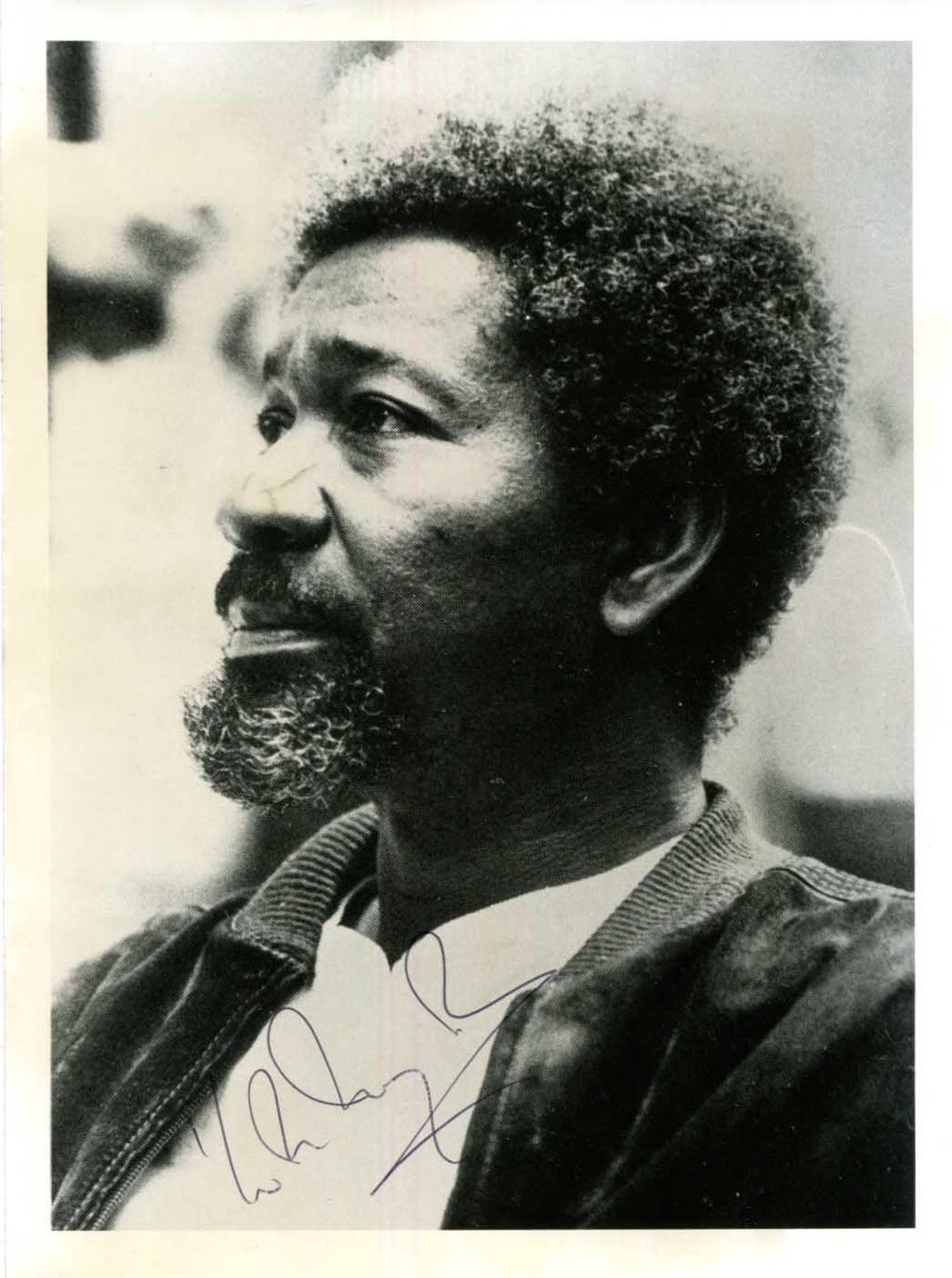 Signed glossy photograph, shows `Wole` Soyinka in a close-up portrait, 7 x 9,5 inch, obtained signed in dark ink, in very fine condition.