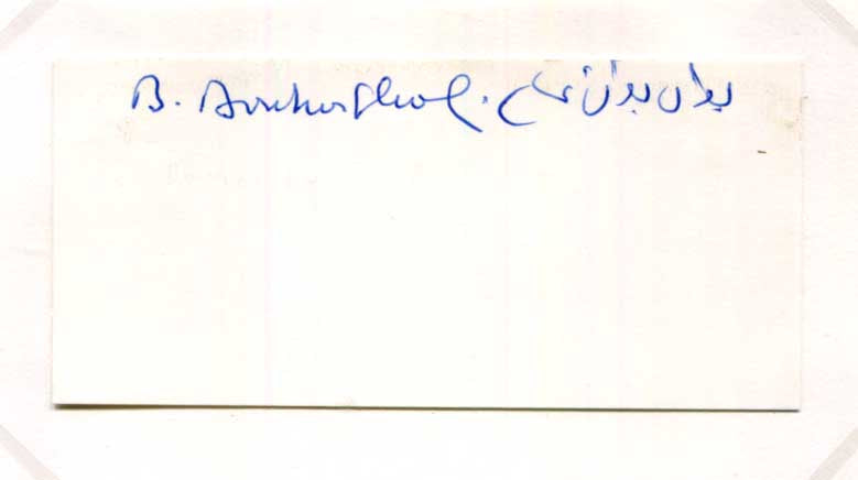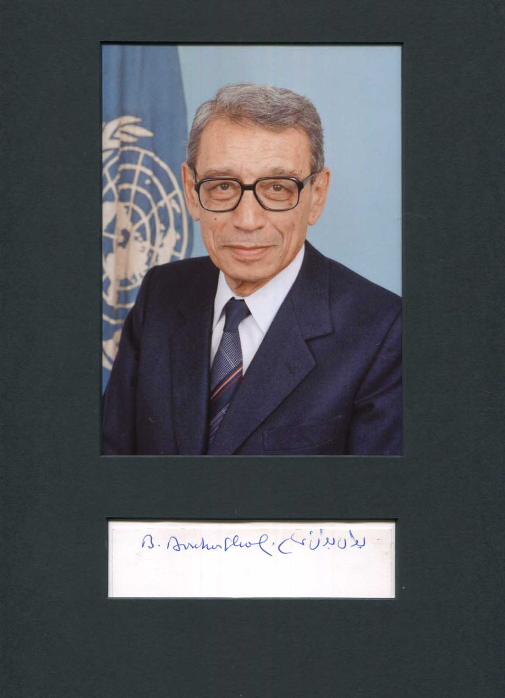 Signed card, 4,5 x 2 inch - affixed on a slightly larger sheet, signed in blue ink, attractively mounted (removable) for fine display with a photograph, shows Boutros Boutros-Ghali in a formal chest-up portrait (altogether 8,25 x 11,75 inch), with very mild signs of wear - in nearly very fine condition.