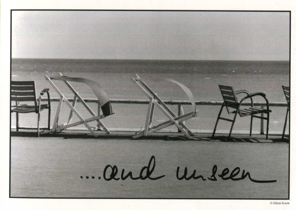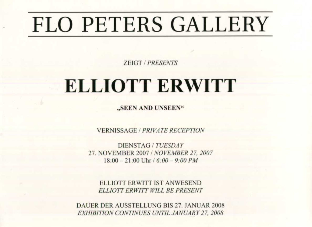 Signed promotion folding card, shows black and white candid photos of Elliott Erwitt for a Vernissage/Private Reception in a gallery, four pages, 8,25 x 5,75 inch, (2007), in German/English, signed in black felt tip "Elliott Erwitt", in very fine condition.