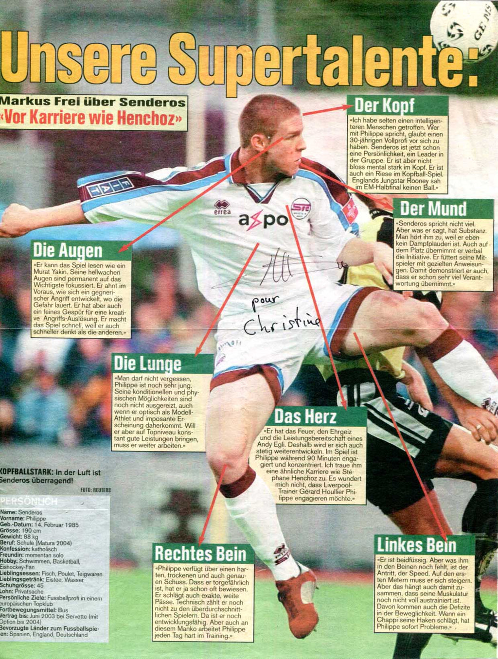 Signed photograph, shows Guillaume Hoarau as footballer (Paris Saint-Germain), 4 x 6 inch, signed in black felt tip, in very fine condition. Accompanied by a magazine picture signed by Philippe Senderos (Servette FC), 8 x 11 inch, signed and inscribed in black ink, in nearly very fine condition.